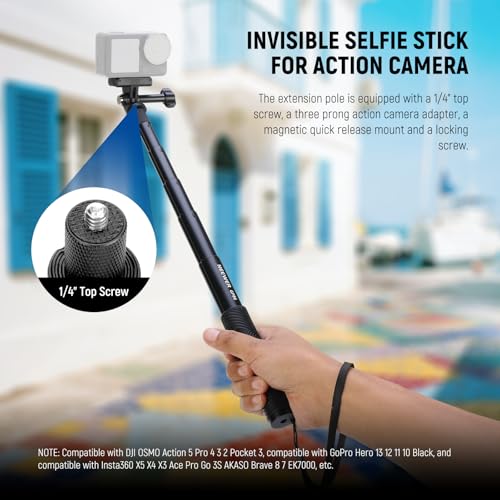 - 【Invisible Selfie Stick for Action Camera】 The portable extension pole stand holder is equipped with a 1/4" top screw, a three prong action camera adapter attachment, a magnetic quick release mount and a locking screw, compatible with DJI OSMO Action 5 Pro 4 3 2 Pocket 3 Creator Combo, compatible with GoPro Hero 13 Go Pro 12 11 10 Black, and compatible with Insta360 X5 X4 X3 Insta 360 Ace Pro Go 3S AKASO Brave 8 7 EK7000, etc., as action camera gear and photography accessories kit
