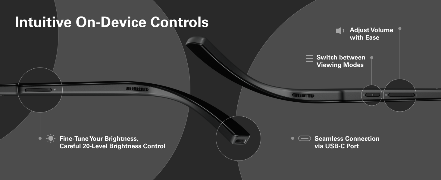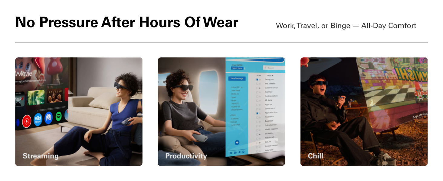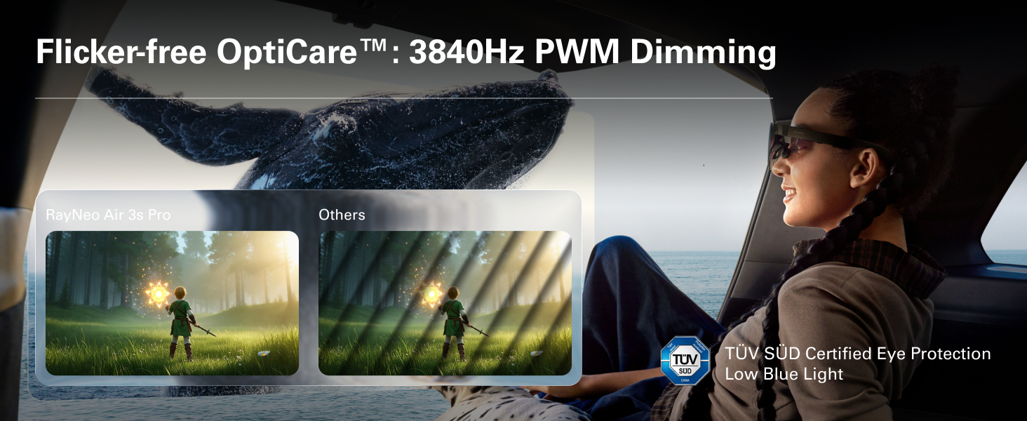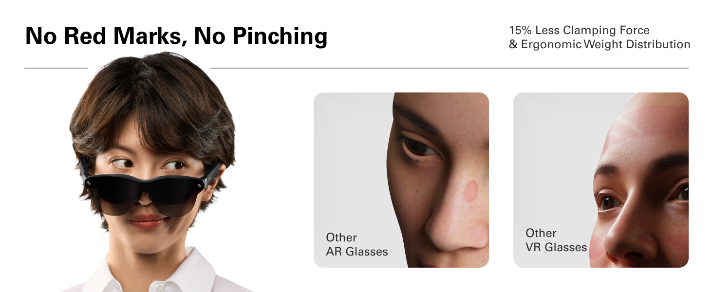 - [Eye Comfort Certified – Binge Without Strain] The only wearable display glasses with TÜV SÜD Low Blue Light & Flicker-Free dual certification, 3,840Hz high-frequency PWM dimming, and 20-level brightness control. Enjoy hours of content with reduced eye fatigue.