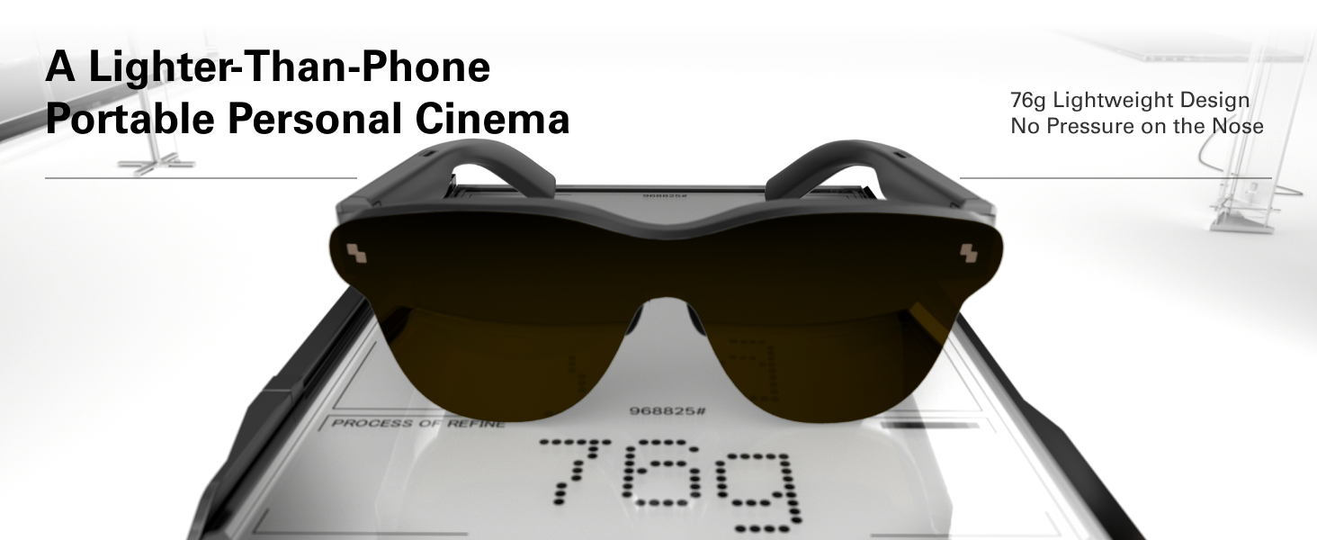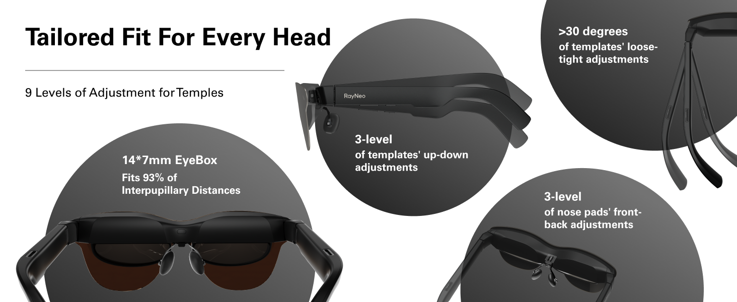 - [Ultra-Light Comfort – Fits Any Face, Any Time] Weighing just 76g, these AR video glasses feature a balanced 46.7%:53.3% weight distribution, adjustable temples (9 levels), and nose pads (3 levels) to fit most global head shapes.