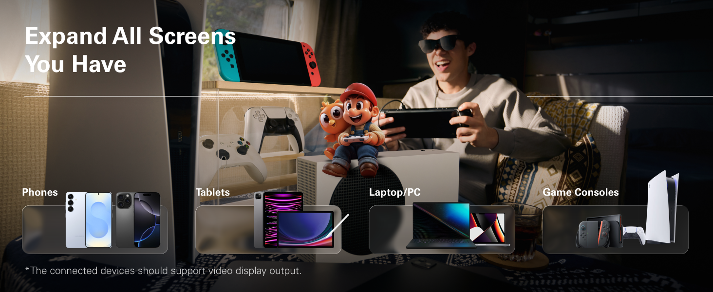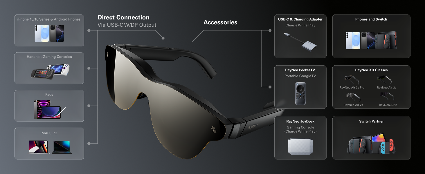 - [Wide Compatibility – Plug & Play Across Platforms] Connect instantly to iOS/Android (DisplayPort supported), PCs/PS5/Xbox via HDMI to glasses and charging adapter, and more. Optional USB-C to glasses adapter is perfect for nonstop viewing or gaming. (*Accessories sold separately)