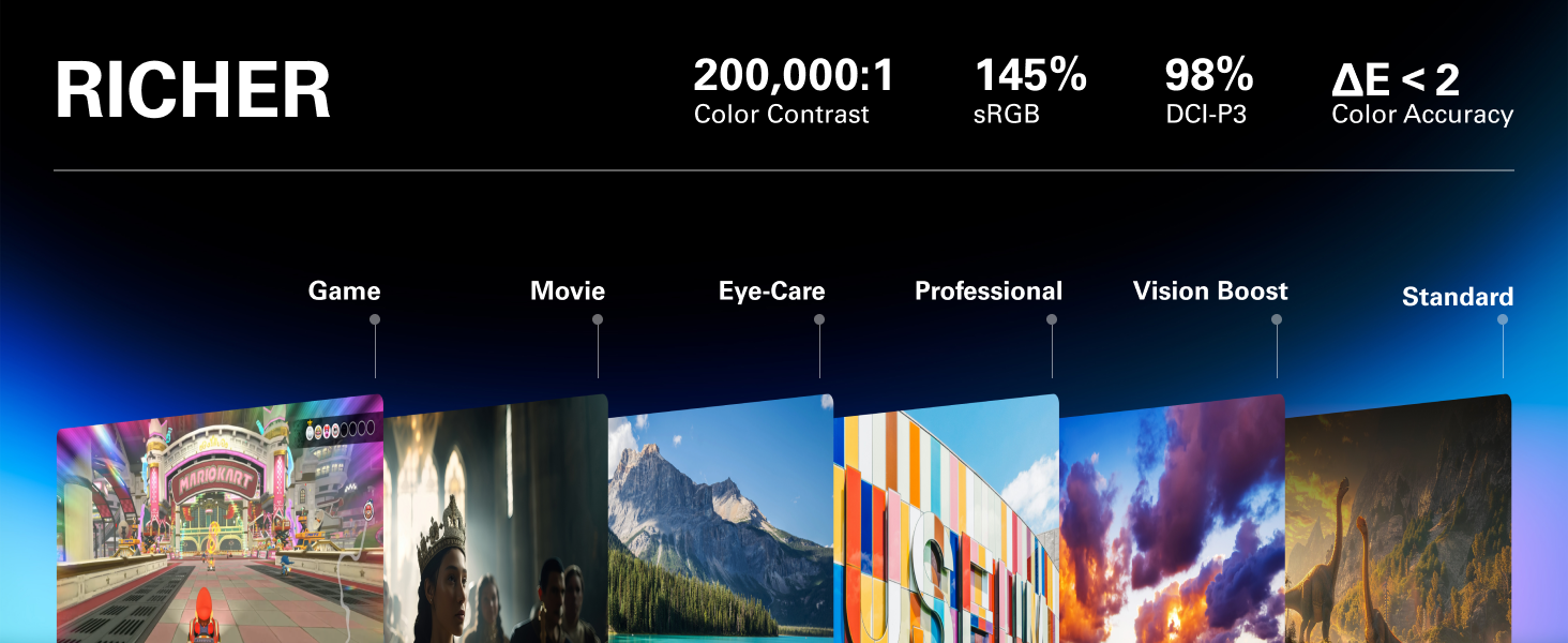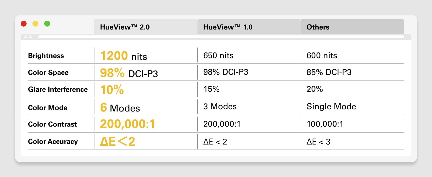 - [HueView 2.0 – Leads Even Father in Micro-OLED Display] Combined with HueView 2.0 — the 5.5th-gen tandem Micro-OLED display, you’ll experience how 200,000:1 and 98% DCI-P3 shape you the most pure and lifelike visuals ever in wearable display glasses.