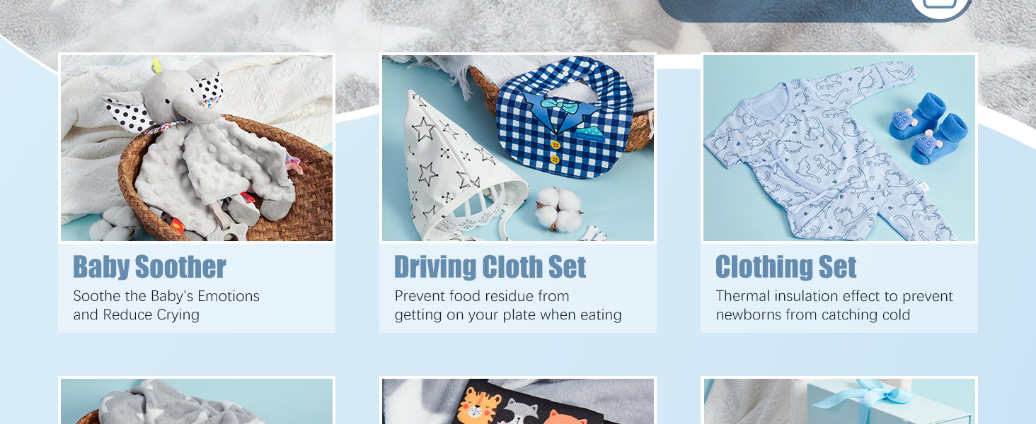 Thoughtful Newborn Baby Gifts Set – Perfect for Baby Showers. This complete newborn baby gifts set includes a soft flannel blanket, cosy security blanket, adorable onesie, waterproof bib, baby socks, baby hat, a charming baby book, and a card with envelope, all beautifully presented in a luxury gift box. Ideal as baby shower gifts, these new born baby essentials are suitable for both baby boys and girls, making it a wonderful surprise for new parents.