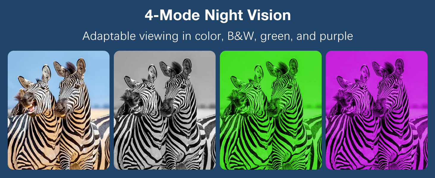 - 36MP Photos & 4K Video – These binoculars with night vision not only provide clear viewing but also let you capture 36MP photos and 4K videos. Choose from four display modes (color, B/W, classic green, highlight purple) to suit different environments.