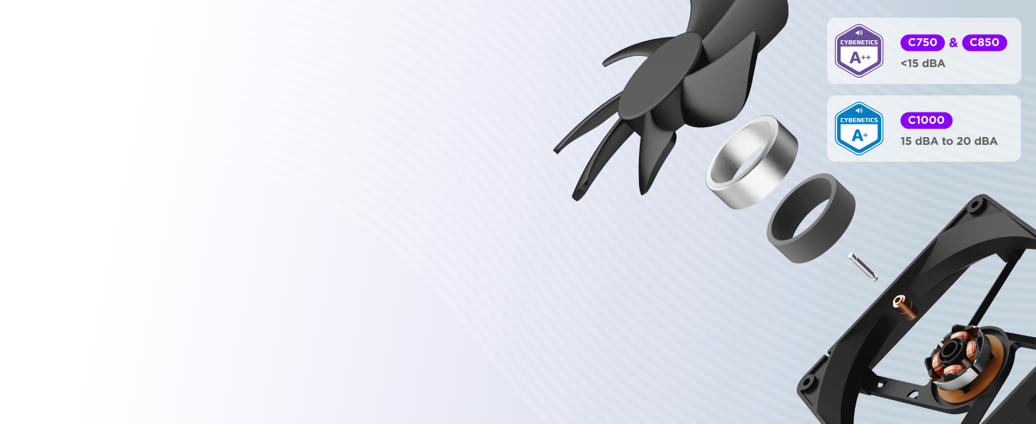 WHISPER-QUIET OPERATION — Cybenetics noise certified for near-silent performance: A++ for C750 and C850 (<15 dBA), A+ for C1000 (15–20 dBA).
