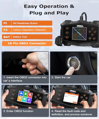 - Plug & Play and Easy Operation: The code reader car diagnostic tool with 320X240 color TFT display, providing a extremely clear view of all the test data results by intuitive icons. There are 9 buttons on car diagnostic scanner: up/down, left/right, OK/EXIT, plus dedicated F1 (I/M readiness), F2 (carbon deposit detection), and BAT (battery test) buttons. Requires no apps, WiFi, or external power—Just get power directly from the OBDII data link connector in your vehicle.