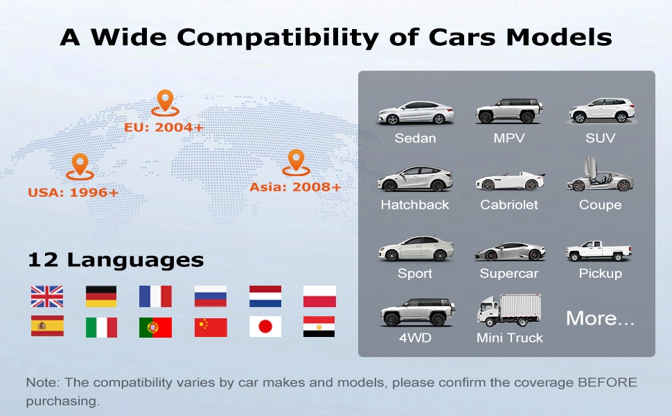 - Wide Vehicle Compatibility: OBD car diagnostic scanner is compatible with most 1996+ US cars, 2000+ EU and Asian cars, light trucks, SUVs, and newer OBD2 and CAN vehicles both at home and abroad. Tips: please verify vehicle compatibility before purchase. The obd2 car code reader supports 12 languages: English, German, French, Spanish, Italian, Portuguese, Russian, Dutch, Polish, Japanese, Chinese, Arabic. It enables you to enjoy a more precise and intuitive user experience.