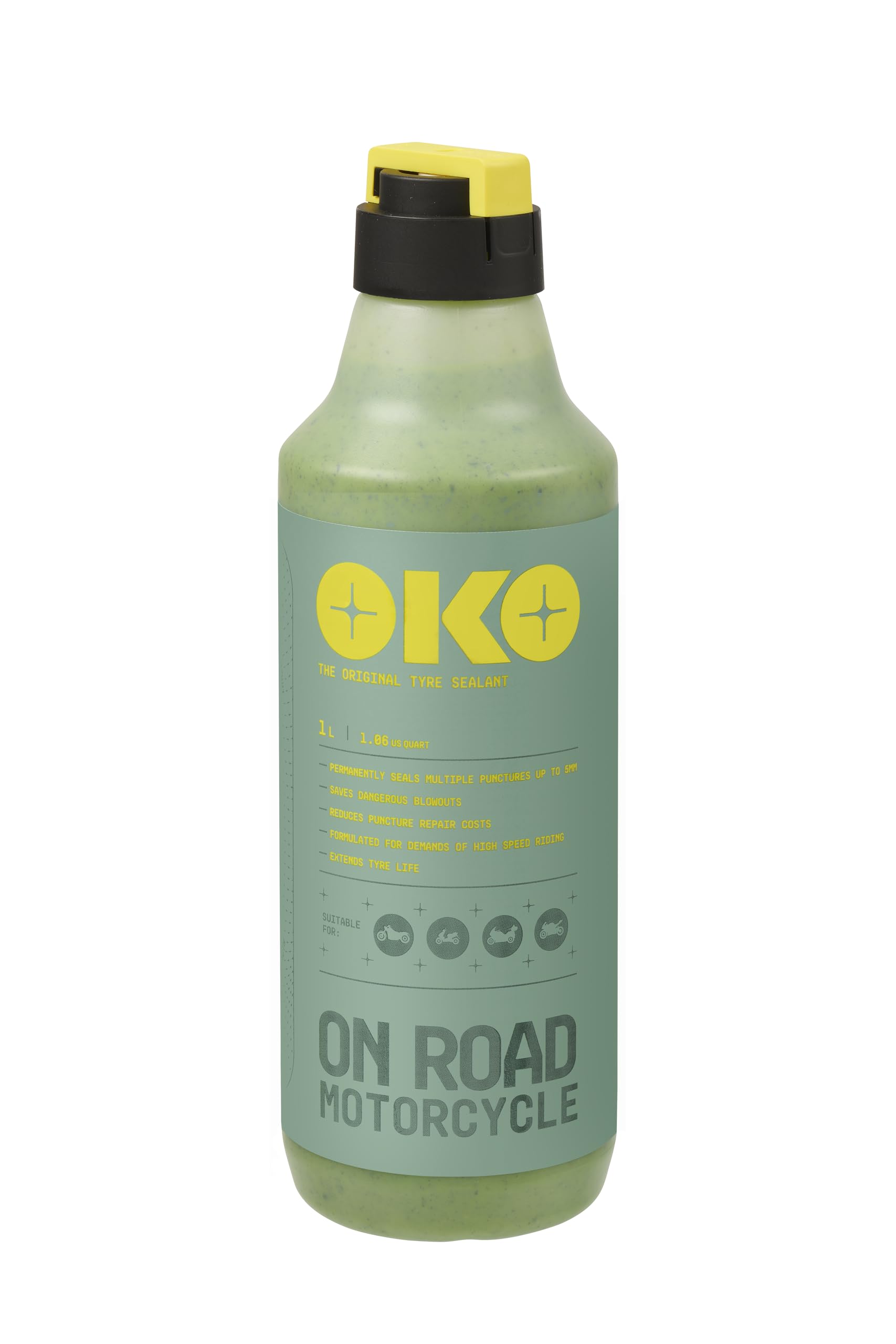 OKO On-Road Motorcycle Tubeless Tyre Sealant 1250ml | Seals Punctures Up to 5mm | Extends Life of Motorbike and Moped Tyres | Innovative Mess-Free Cap | Non-Allergenic
