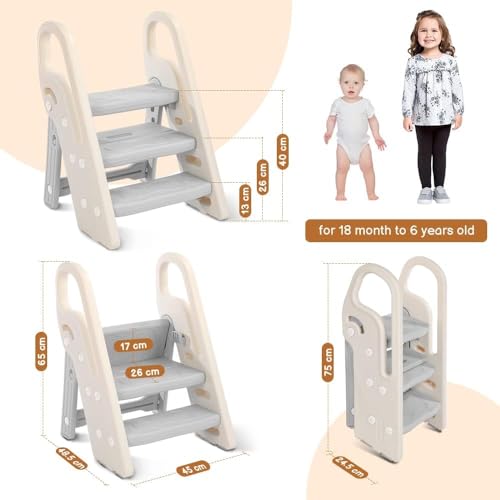 Onasti Toddler Step Stool, 2/3 Steps Height Adjustable, Foldable Kids Step Stool with Handrails, Anti-Slip, Multifunctional, Ideal for Bathroom and Kitchen (Grey)