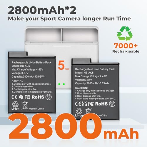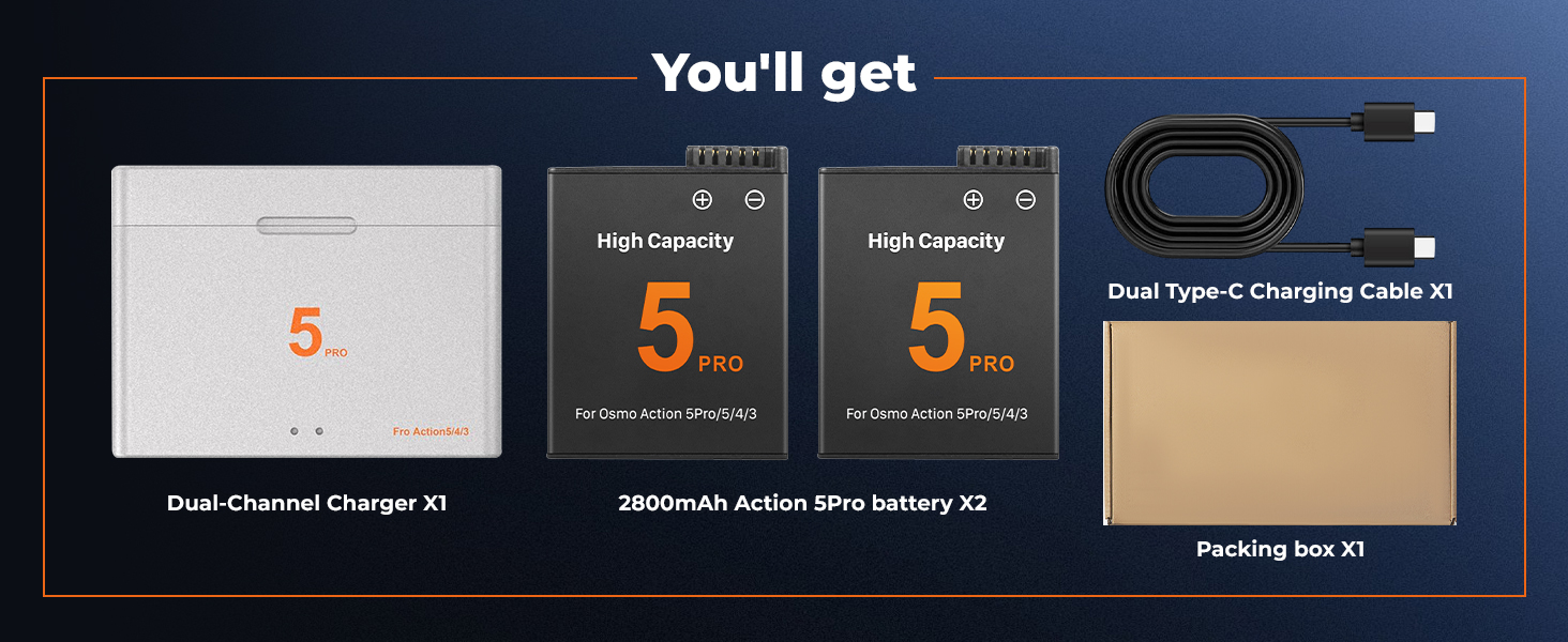 - 【Package contents】2 x Osmo Action 5 Pro battery (2800mAh), 1 x LED charger, 1 x Type-C cable. 12-month warranty, 24-hour friendly response. If there is a problem with the battery, you can respond at any time.