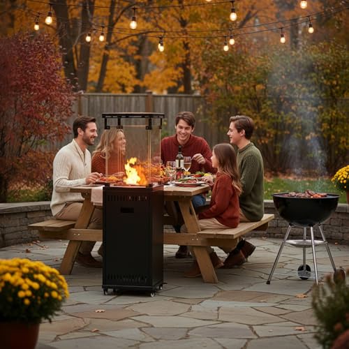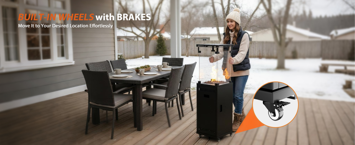 Ultra Portable With Sturdy Wheels: Move warmth wherever you need it with ease! Unlike bulky fixed heaters, our patio heater comes with 4 heavy-duty, portable wheels. Simply tilt and roll to reposition your heat source from the dining area to the lounge space in your garden in seconds. No heavy lifting required