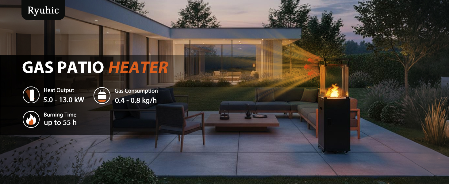 Powerful & Wide-Reaching Heat: 13kW High Output. Experience superior warmth with our high-efficiency 13kW outdoor heater. Designed to comfortably heat a larger area than standard 8kW models, it ensures your garden, patio, or terrace stays inviting even on cooler British evenings. The powerful upward heat projection creates a radiant warmth zone for everyone to enjoy