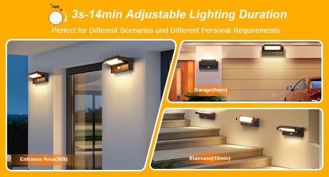 When you turn the time arrow clockwise, the lighting duration is extended from 3 seconds to up to 14 minutes. This makes outdoor pir wall light ideal for various usage scenarios and offers more flexibility than other motion-activated lights.