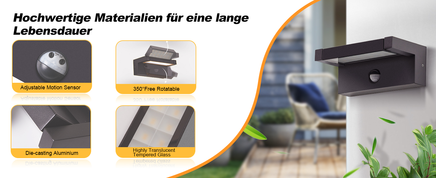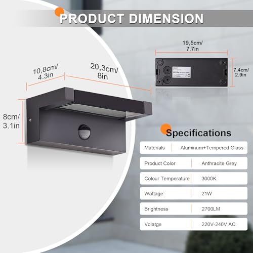 - 【Easy Installation】: We provide you with a high-quality sensor light outdoor, made from robust aluminum die-cast with careful painting and a tempered glass lampshade that offers excellent light transmission. Additionally, you will receive all the mounting accessories and a multilingual user manual to make the installation as straightforward as possible.