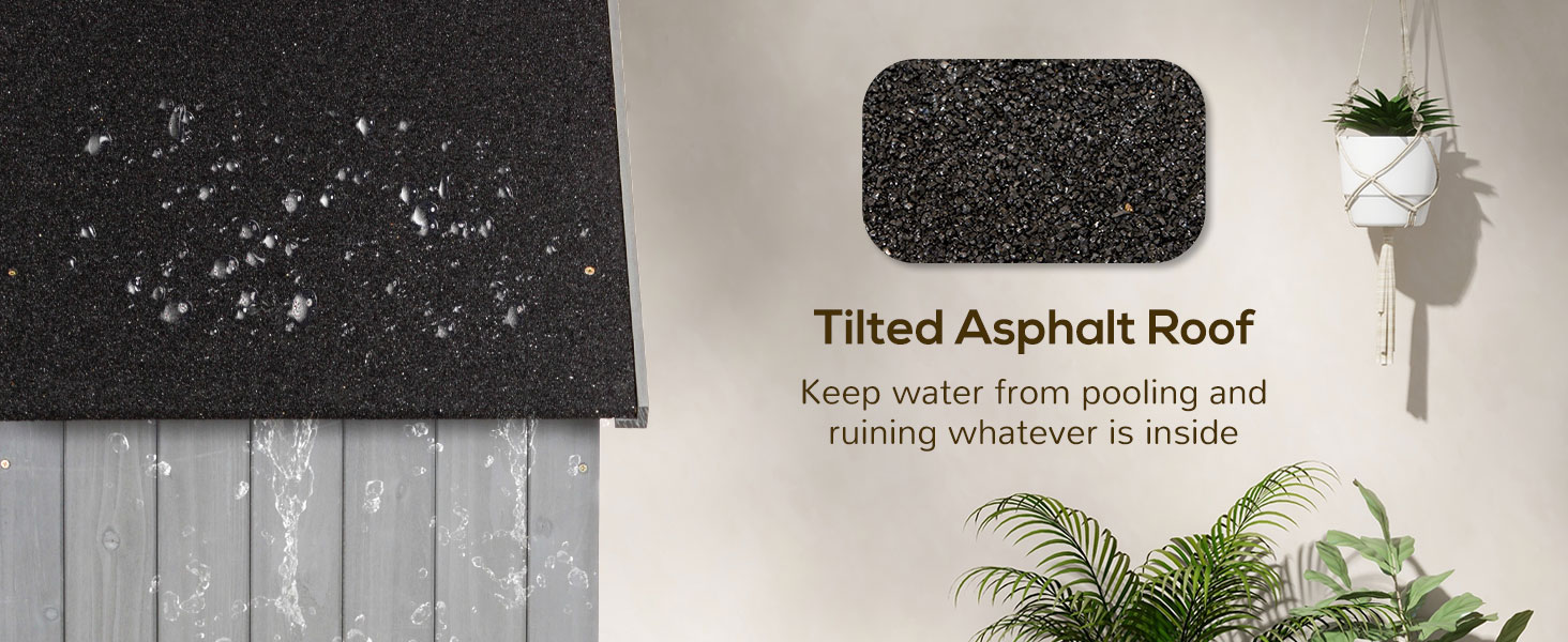 - Asphalt-covered roof: Slanted with felt helps prevent water build-up, keeping inside protected and dry.