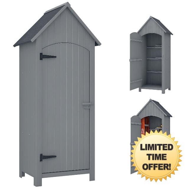 Outsunny Wooden Garden Storage Shed with 3 Shelves, Outdoor Tool Storage Cabinet with Tilt Roof and Lockable Door, 77.5 x 54.2 x 179.5 cm, Grey