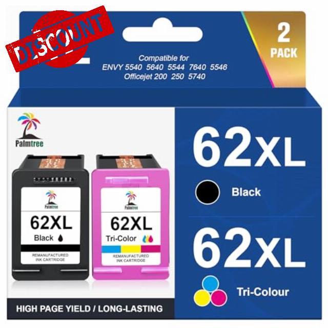 Palmtree 62XL Ink Cartridges Combo Pack Replacement for HP 62 Ink Cartridges Black and Colour for HP OfficeJet 250 200 5740 5742 Envy 5540 5640 5546 5544 7640 5644 5541 5646 5542