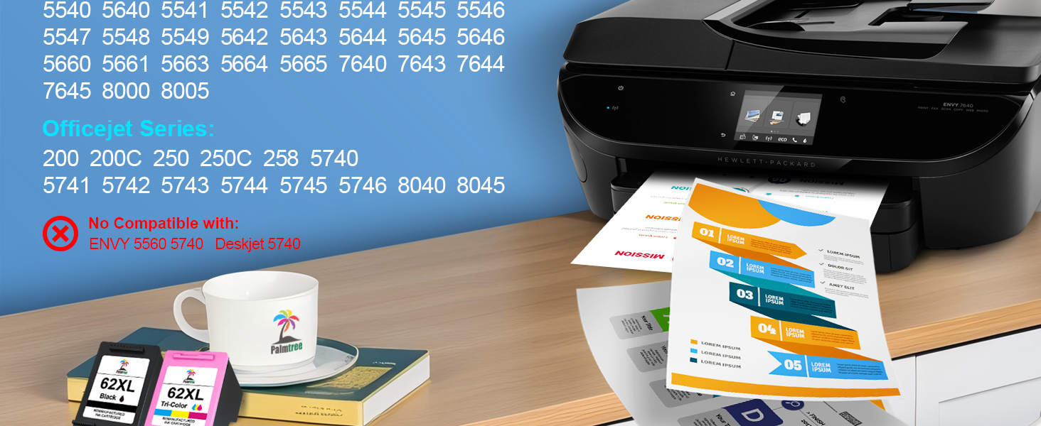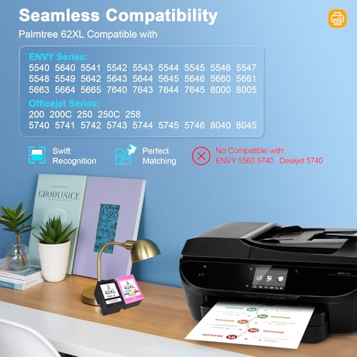 - Seamless Compatibility:Palmtree 62XL ink cartridges work flawlessly with HP ENVY 5540 5640 5541 5542 5543 5544 5545 5546 5547 5548 5549 5642 5643 5644 5645 5646 5660 5661 5663 5664 5665 7640 7643 7644 7645 8000 8005; HP Officejet 200 200C 250 250C 258 5740 5741 5742 5743 5744 5745 5746 8040 8045 .ensuring smooth printing from the first page to the last. Enjoy easy installation and stable performance for all your daily print jobs