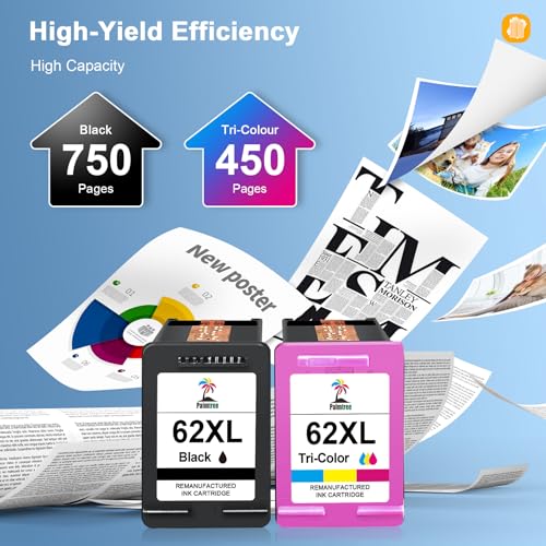 - High-Yield Efficiency: Palmtree 62XL black cartridges deliver up to 750 pages each, while 62XL color cartridges deliver up to 450 pages each (A4, 5% coverage). Print more with fewer interruptions while saving on costs—ideal for both frequent and budget-conscious users