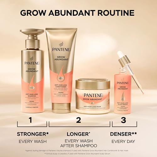 Looking for fuller days ahead Discover Pantene Grow Abundant Anti-Hair Loss Hair Mask, designed to deeply nourish damaged hair while helping it grow longer. Enriched with 2000MG PRO-VITAMIN COMPLEX and amino acids, its formula makes hair stronger, boosting resilience against breakage and promoting visibly healthier, denser hair. For best results, use it with the Grow Abundant Serum. Longer, stronger against styling damage vs Pantene Volume shampoo. Thicker, denser: clinical study vs placebo.