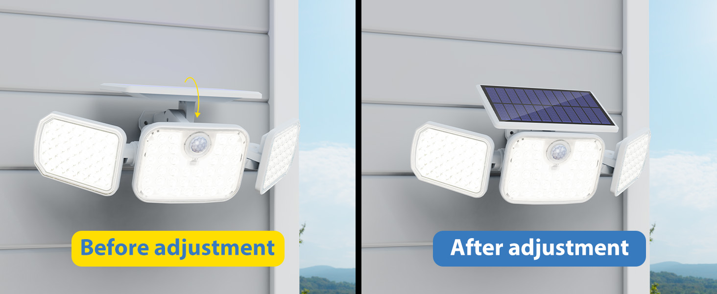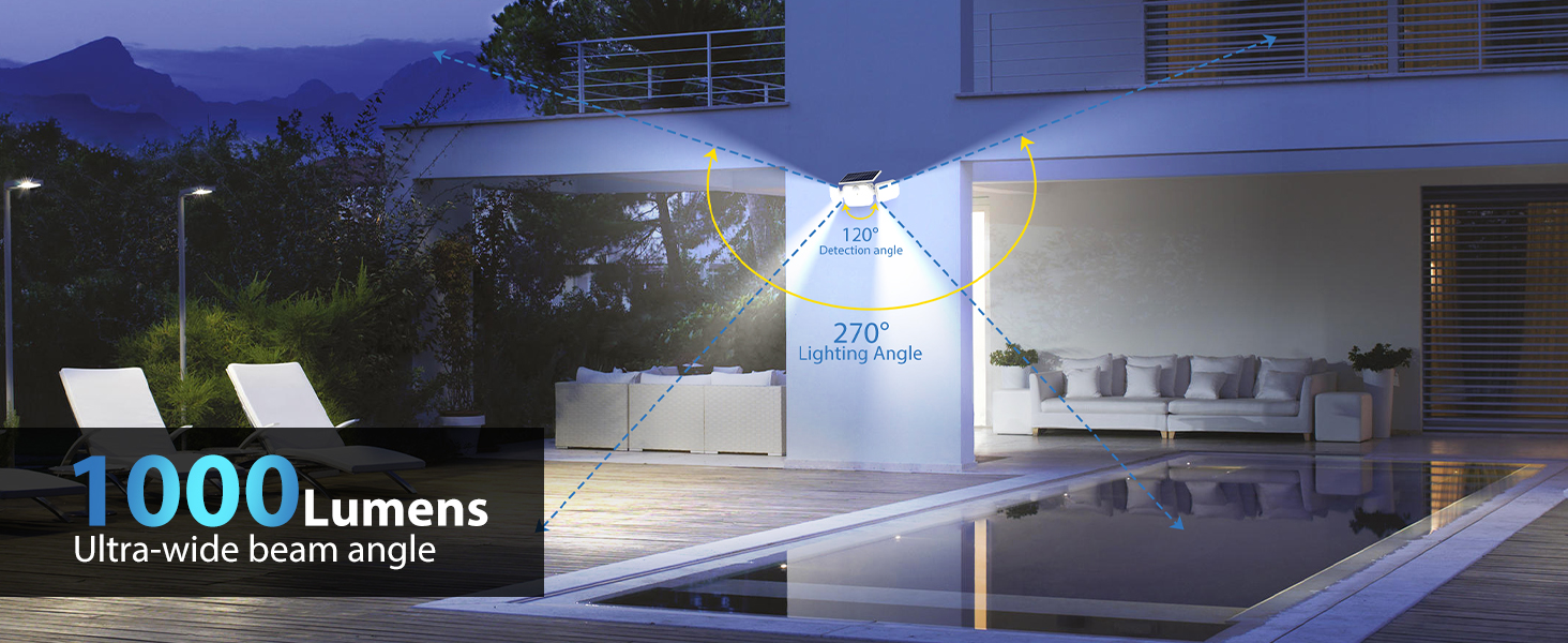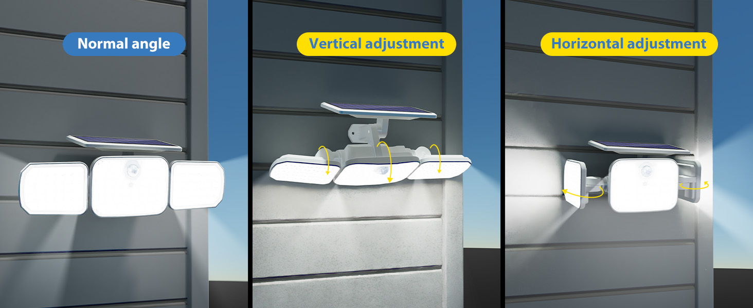 The maximum range of the sensor of this solar wall light is 120°, when exceeding this range, the brightness of the three lights will be inconsistent. Finally, it is recommended to try to center the sensor and spread it out 60% on each side.