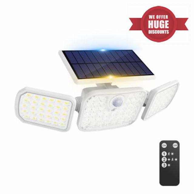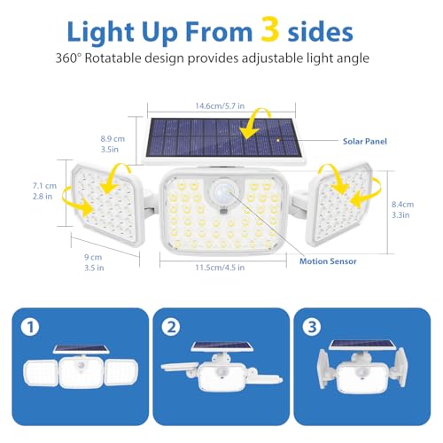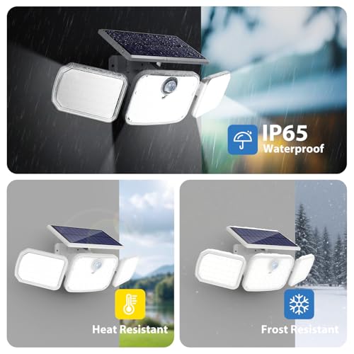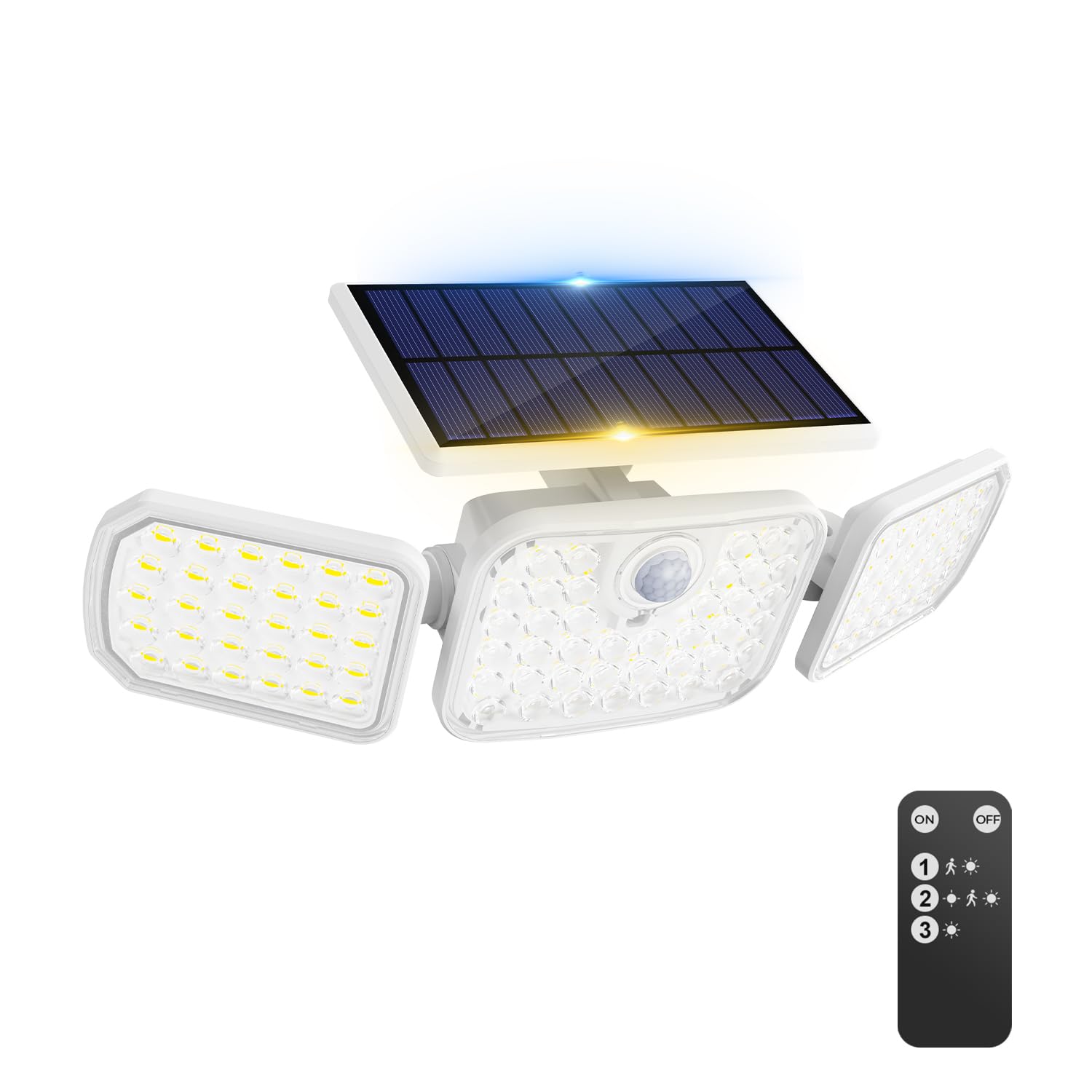 Peasur Solar Security Lights Outdoor Motion Sensor White Frame with 3 Modes, Solar Powered Flood Light with Remote Control 3 Adjustable Heads, IP65 Waterproof Wall Mount Wireless for Yard Garage [Energy Class E]