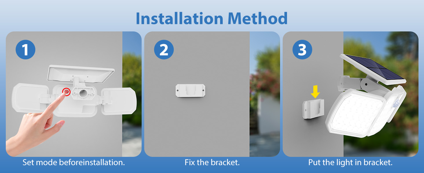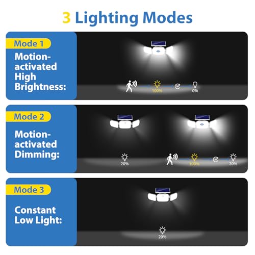 - 【3 lighting modes】① Off > Detect motion to turn on 30S (100% brightness) > Automatically turn off ② Dim mode (20% brightness) > Detect motion to turn on 30S (100% brightness) > Dim mode ③ Long light mode (20% brightness), recommended mode ① is more energy-saving