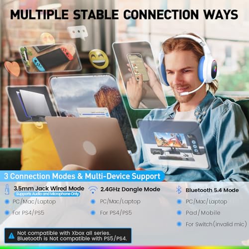 - ️Note: The headset is not compatible with all Xbox series. The Bluetooth mode is not compatible with PS4 and PS5. ️The microphone does not work with the Nintendo Switch. The 2.4 GHz mode of the wireless headset is compatible with PS5, PS4, PC, laptops and Mac, and the Bluetooth mode is compatible with smart devices such as mobile phones, laptops and tablets
