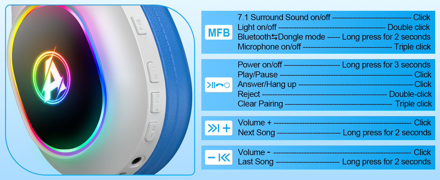 - ️Note: In wired mode, the gaming headset is plug and play. ️The headset is turned off, the buttons do not work and the RGB lighting is not available. Volume control and playback control are controlled via your device