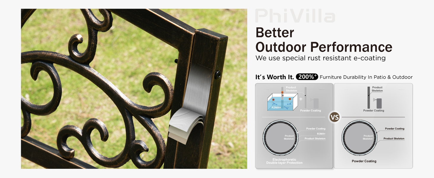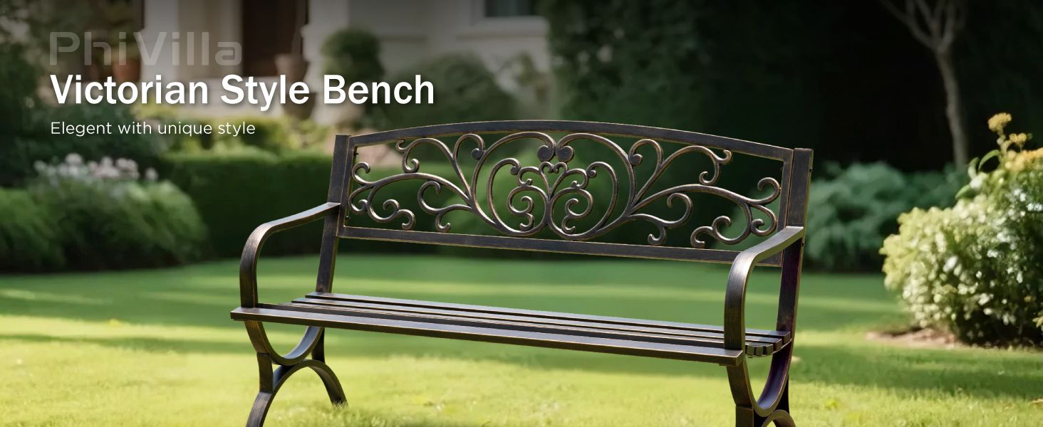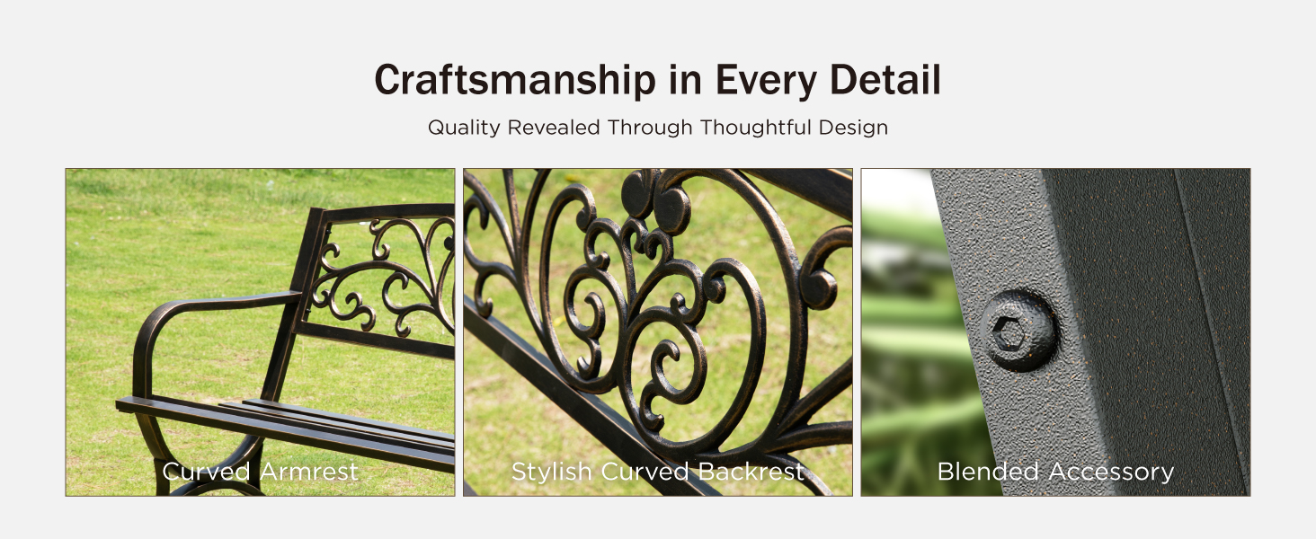Sturdy and Rust-Resistant: Our garden bench features a robust powder-coated finish that resists rust, ensuring it remains smooth and beautiful over time. Made with a solid cast iron backrest and a sturdy metal frame, this metal garden bench is built for long-lasting use