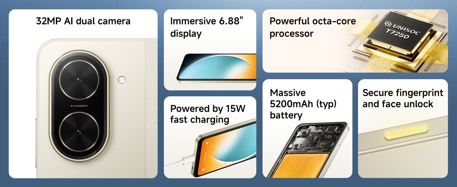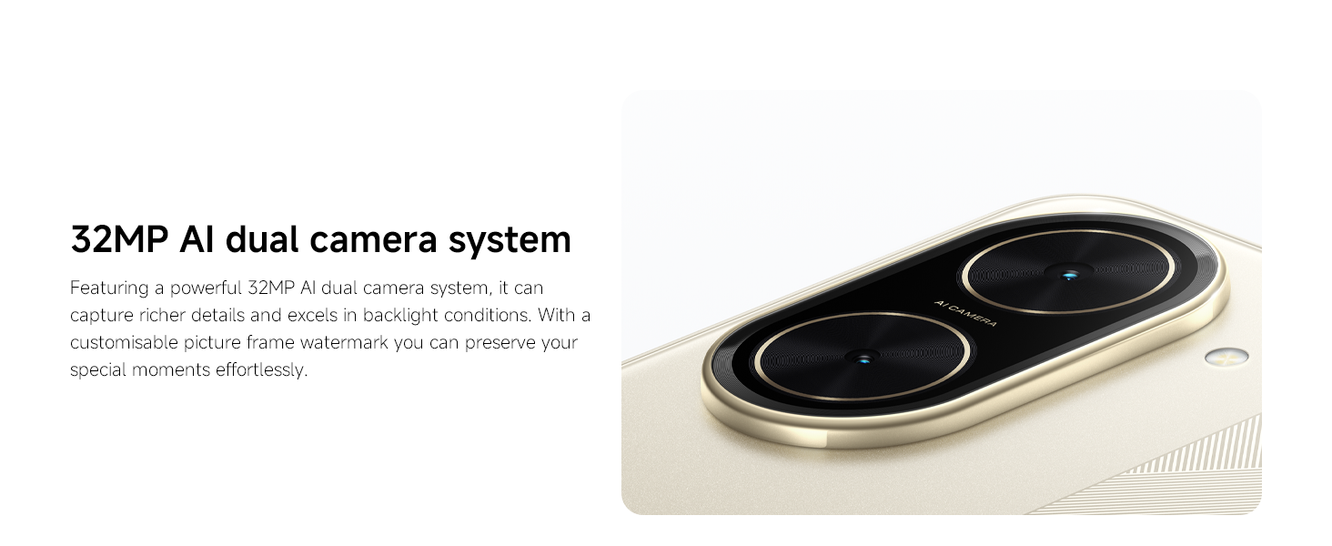 - 【Stunning imagery】Featuring a powerful 32MP AI dual camera system, it can capture richer details and excels in backlight conditions. With a customisable picture frame watermark you can preserve your special moments effortlessly.