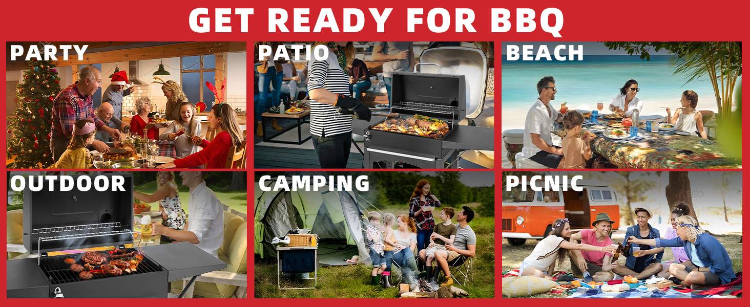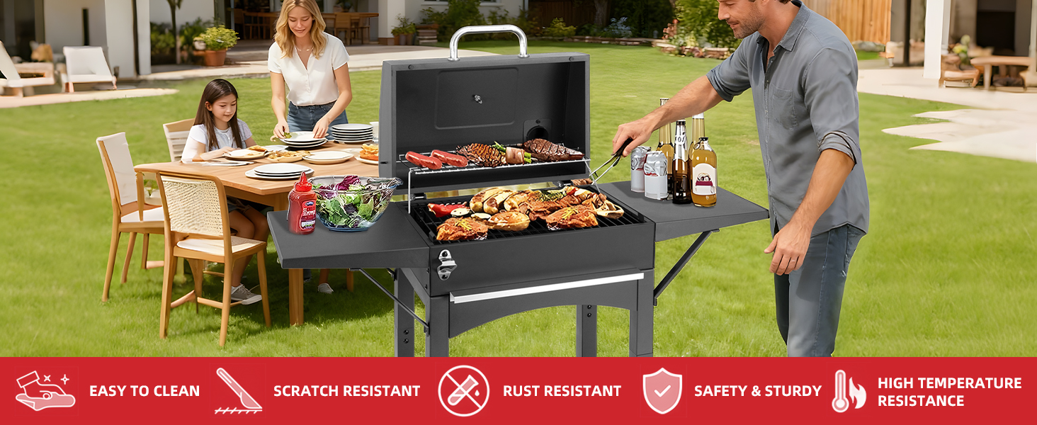 The charcoal grill with a large storage area on the bottom shelf is perfect for various outdoor occasions.You'll handle it with ease,whether it's a weekend family gathering, a friends' party, or a camping cookout.