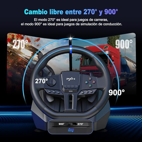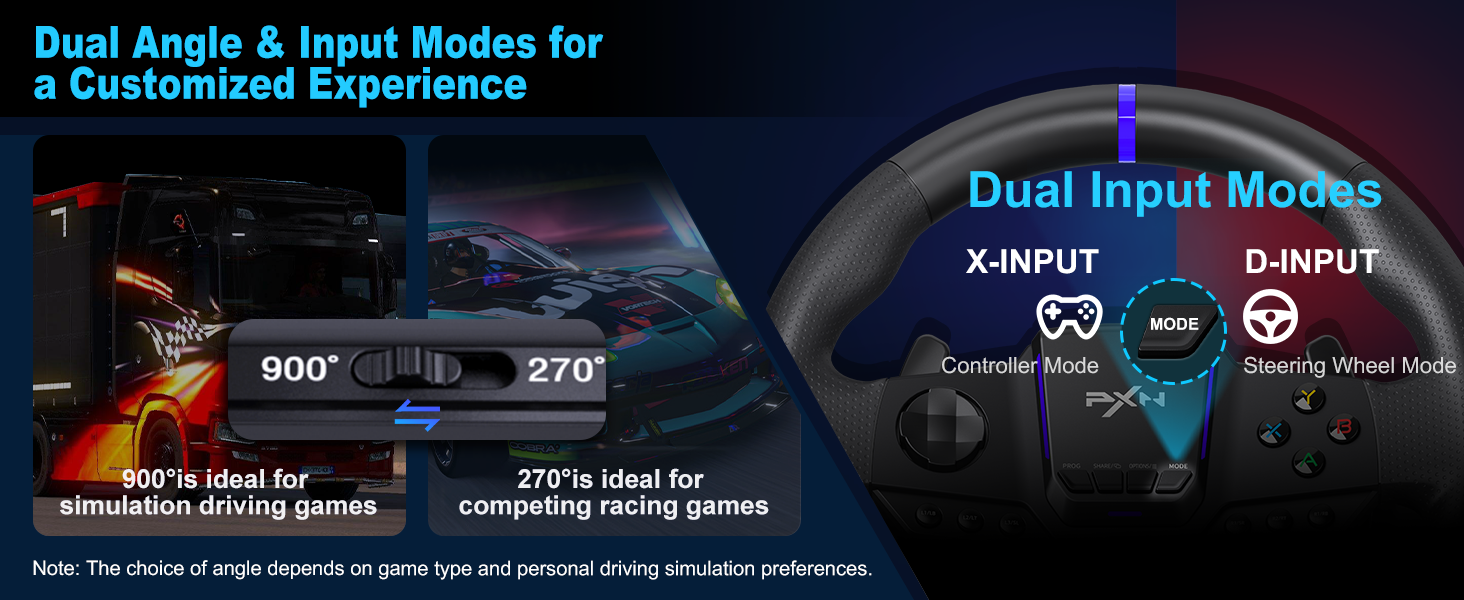 - DUAL MODE STEERING: Features 270° mode for racing games and 900° mode for simulation games, with easy single-button switching between modes