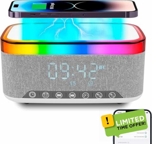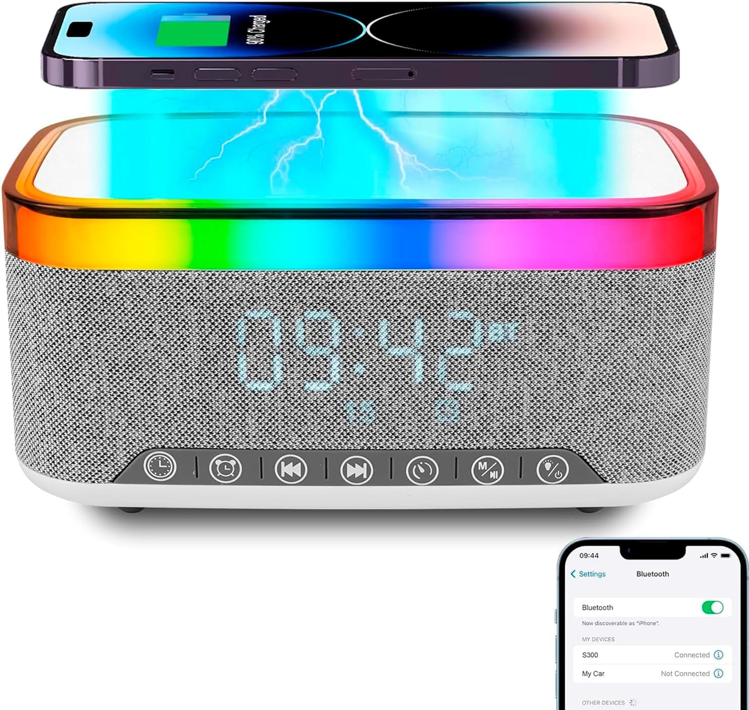Radio Alarm Clock Bedside, Atmosphere Digital Alarm Clocks with 15W Wireless Charger, 5.3 Bluetooth Speaker, Fast Qi Wireless Charger, FM Radio, USB Charging Port, Table Lamp for Bedroom, Des [Energy Class F]