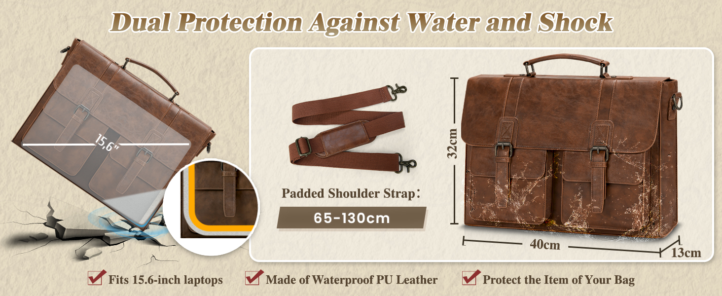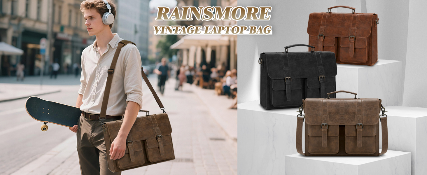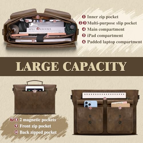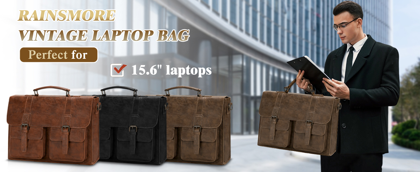 RAINSMORE Messenger Bag Briefcase for Men Waterproof PU Leather Bag 15.6 Inch Vintage Satchel Bag for Work Business Office College