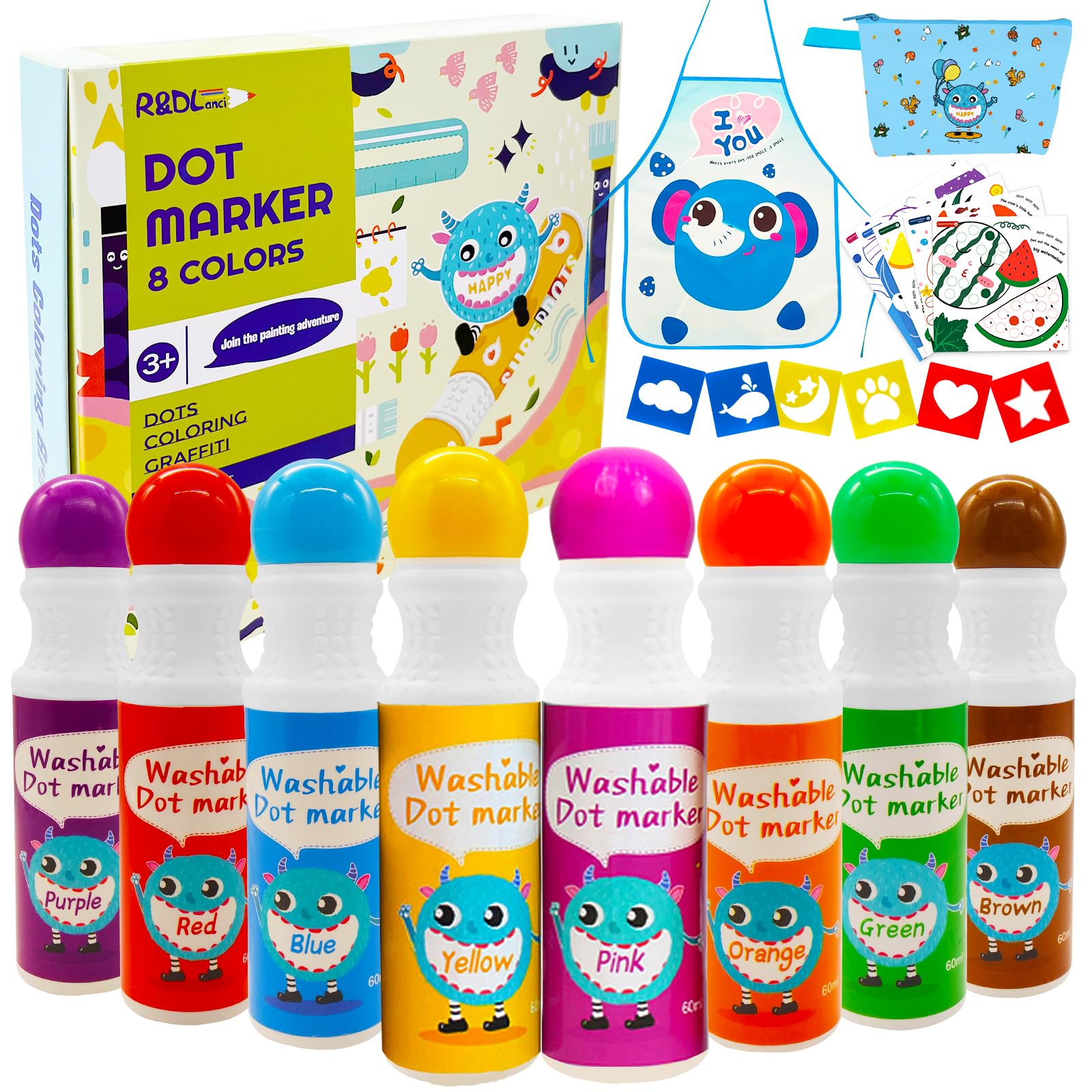 - 【An ideal dot marker set】The washable dot markers set contains 8-colours Dot markers,12-Activity colouring papers and 108 PDF for download ,6-Stencils, a small apron for toddlers and one bag which can hold all the 8 pieces of dot markers.