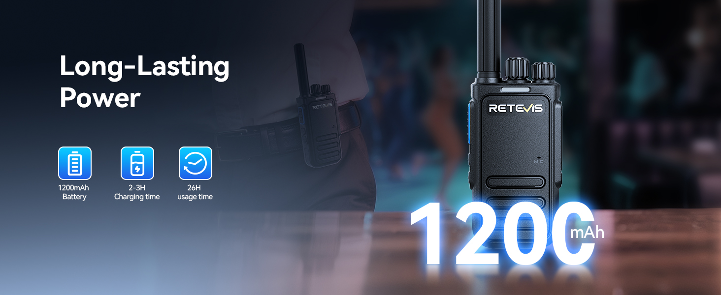 - Long battery life; walkie talkies rechargeable's 1200mAh battery ensures up to 30 hours of standby time and a full 26/19 hours of use; meaning fewer charging breaks; right for industries where long shifts or construction projects