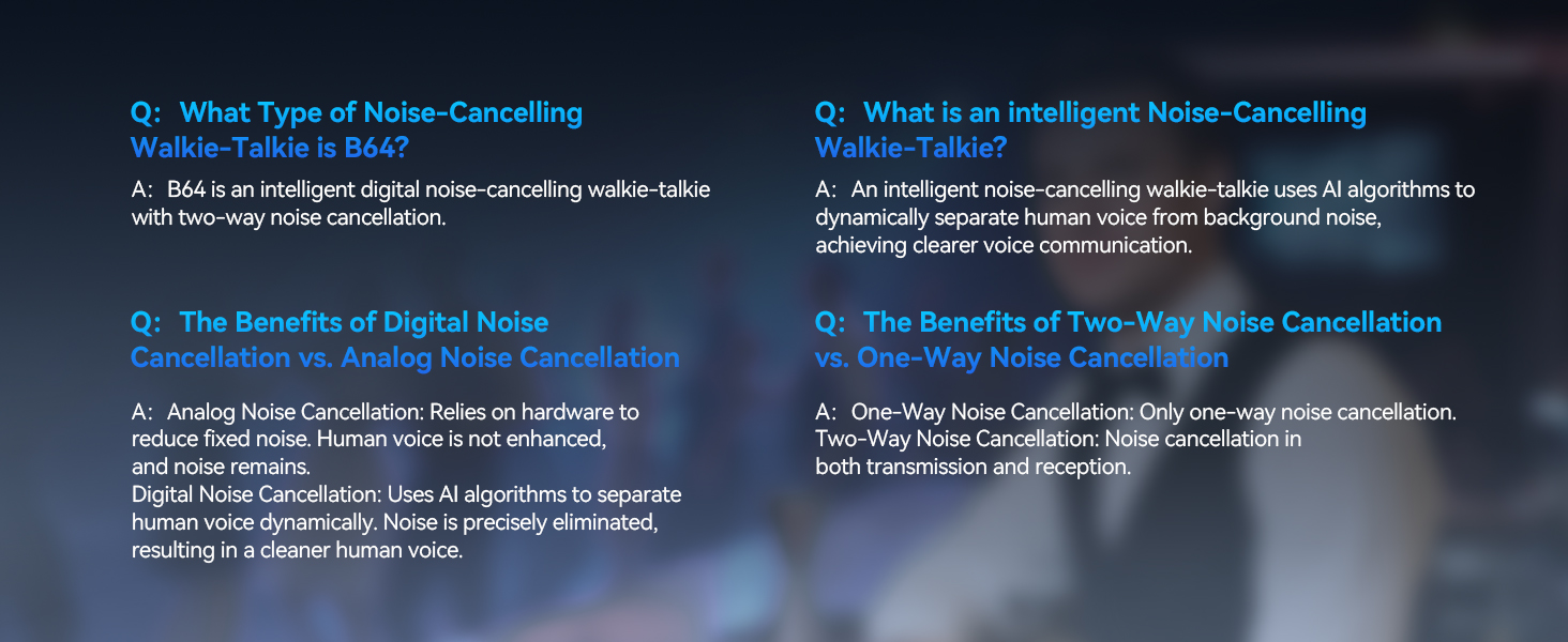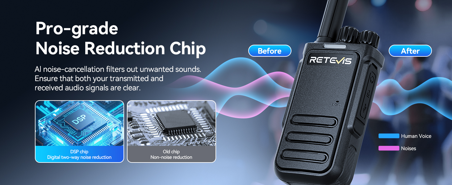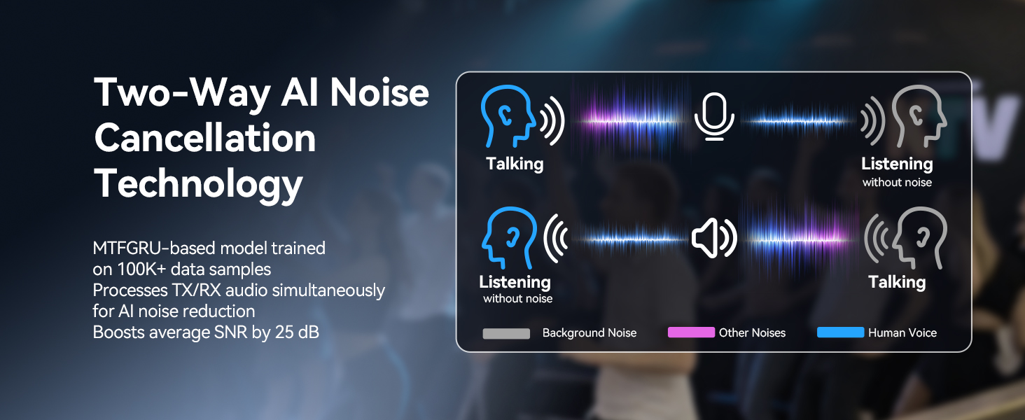 - AI-powered noise reduction; jobsite walkie talkies trained on 100,000+ data samples using the MTFGRU model; reduces jackhammer roars and heavy machinery din; with a 25dB SNR boost; your crew hears orders clearly; even in chaotic environments