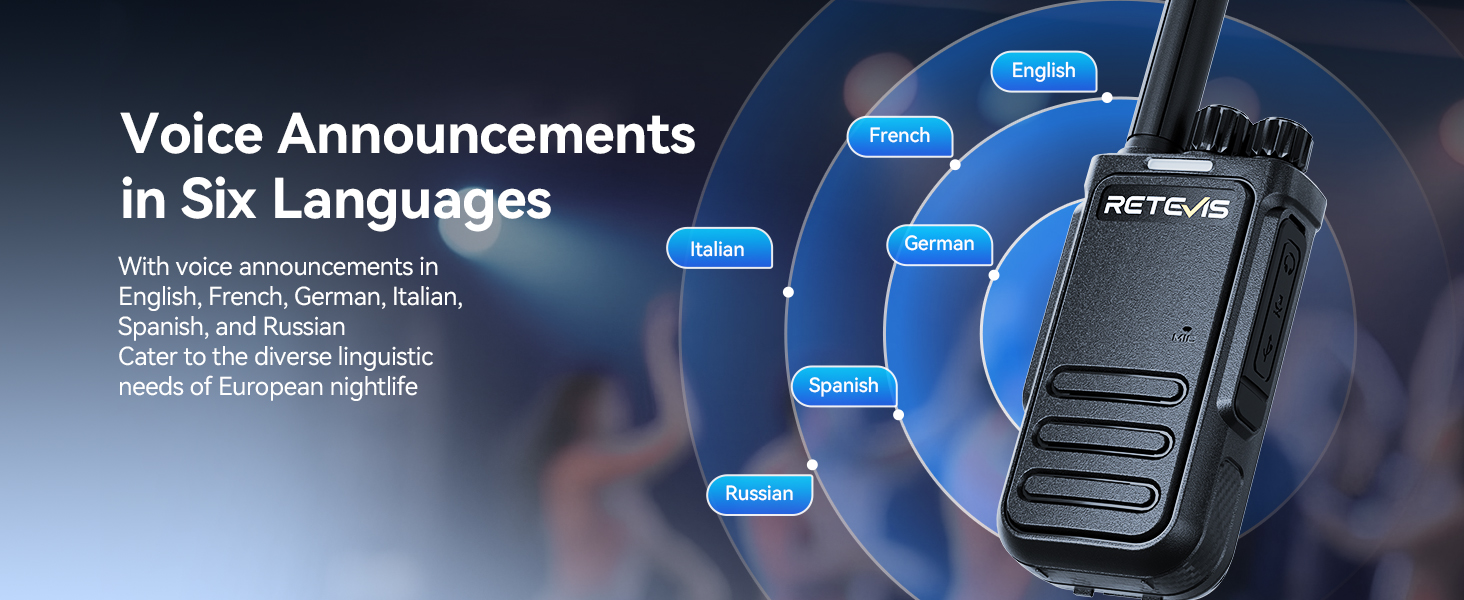 - 6 languages prompt; English; German; Spanish; French; Italian; and Russian; whether you're overseeing a multinational team at a construction site or coordinating repair shops in different countries; commercial walkie talkies break down language barriers