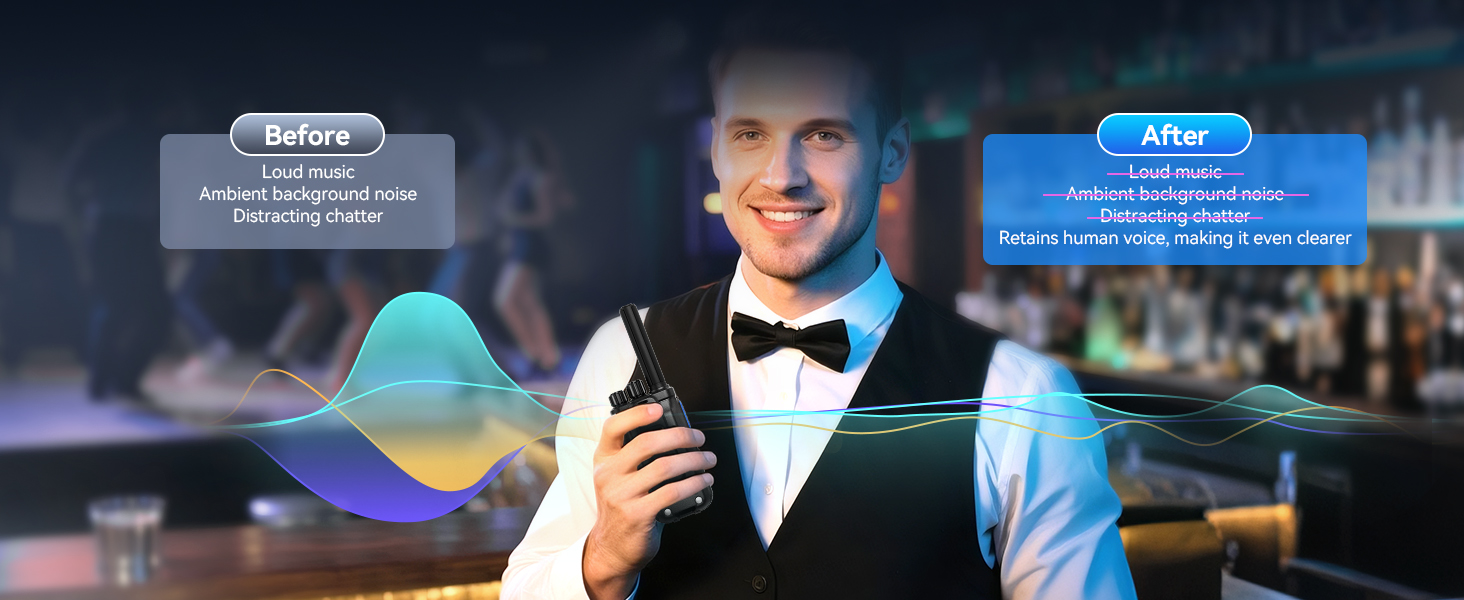 Activate VOX mode to transmit hands-free. Right for bartenders juggling drinks or security staff watching crowds—no buttons, no distractions.