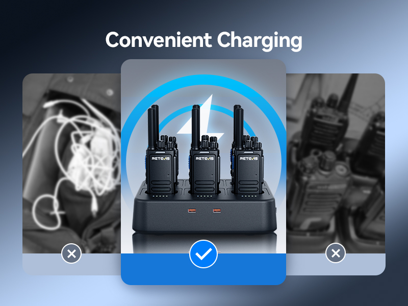 - Easy to charge; charge the walkie talkies for adults via Type-C cable on the go or charge with the base charger; suitable for light industry crews needing quick recharges between shifts; at KTVs; Type-C cable keeps radios charged for marathon sessions