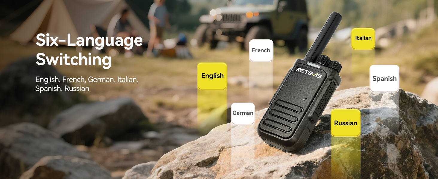 - 6 languages prompt; English; German; Spanish; French; Italian; and Russian; whether you're overseeing a multinational team at a construction site or coordinating repair shops in different countries; commercial walkie talkies break down language barriers