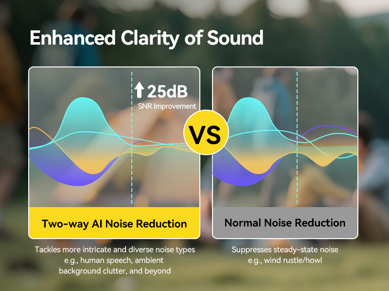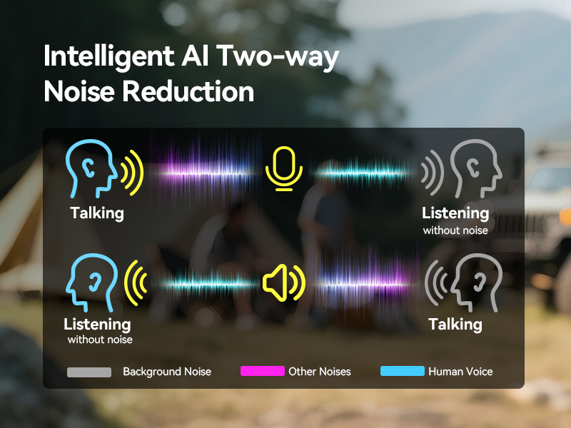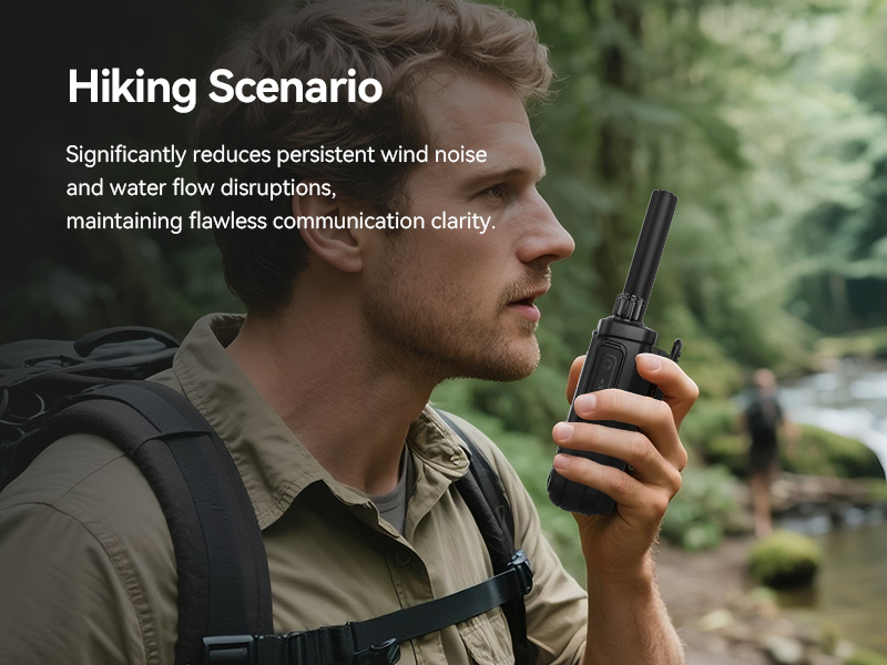 When camping, background noises like rustling leaves, flowing streams, or chirping birds can disrupt communication. The AI noise reduction effectively suppresses these distractions, every word will be heard loud and clear.
