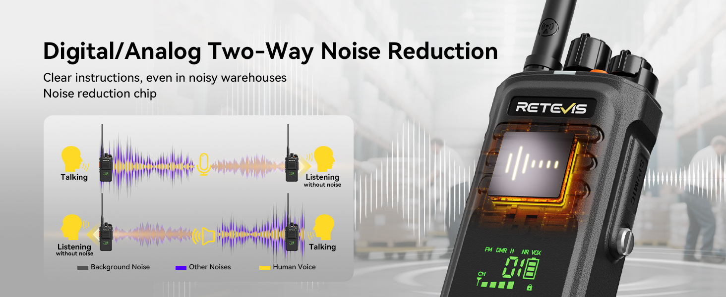 - Clear communication; NR40 digital 2 way radio with two-way radio and intelligent audio; continuously watch ambient noise levels and adjust noise cancellation intensity in seconds; whether you’re in a silent control room or a roaring transportation hub