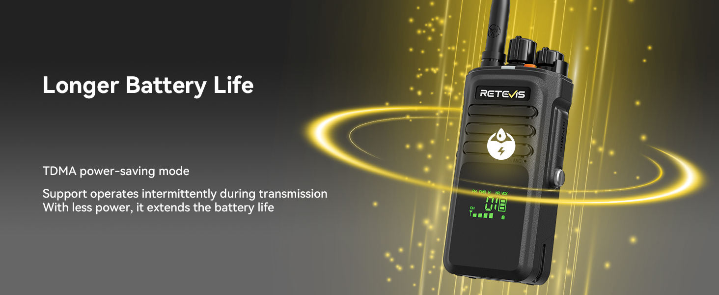 - Long battery life; throughout long shifts without the need for frequent recharges; DMR radio with 2800mAh battery provides up to 20 hours of continuous use and 90 hours of standby time; ensuring that you're always reachable when you need