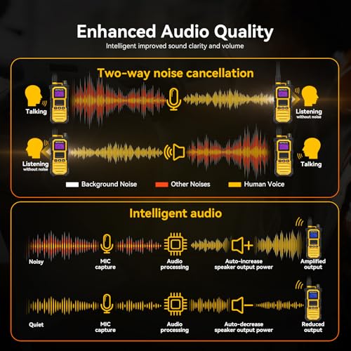- Intelligent audio; walkie talkies dynamically adjusts audio power (0.28W-1W) based on real-time noise levels (60dB-100dB+); ensuring clear communication in high-decibel construction environments like pile driving or steel erection