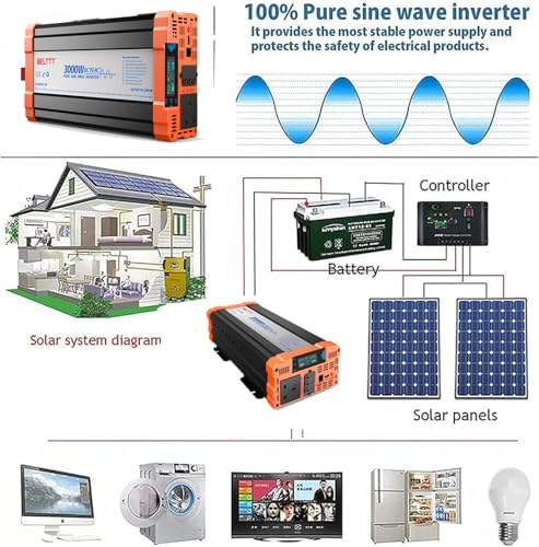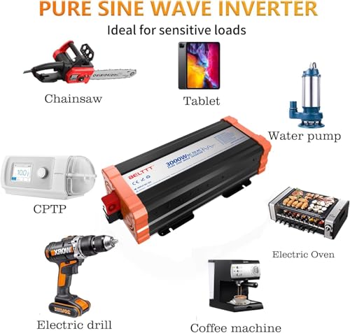 - 【3000W Pure Sine Wave Inverter】True 3000W Pure Sine Wave Converter, peak power 6000W, DC 12V input, AC 240V output; Compared with modified inverters, our 3000W Pure Sine Wave Inverter is able to generate cleaner, smoother, quieter, more reliable power supply, and provide greater drive capacity, better protect sensitive equipment, reduce noise and reduce power consumption