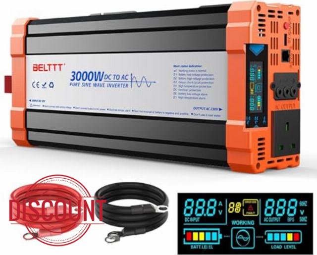 - 【3000W Pure Sine Wave Inverter】True 3000W Pure Sine Wave Converter, peak power 6000W, DC 12V input, AC 240V output; Compared with modified inverters, our 3000W Pure Sine Wave Inverter is able to generate cleaner, smoother, quieter, more reliable power supply, and provide greater drive capacity, better protect sensitive equipment, reduce noise and reduce power consumption