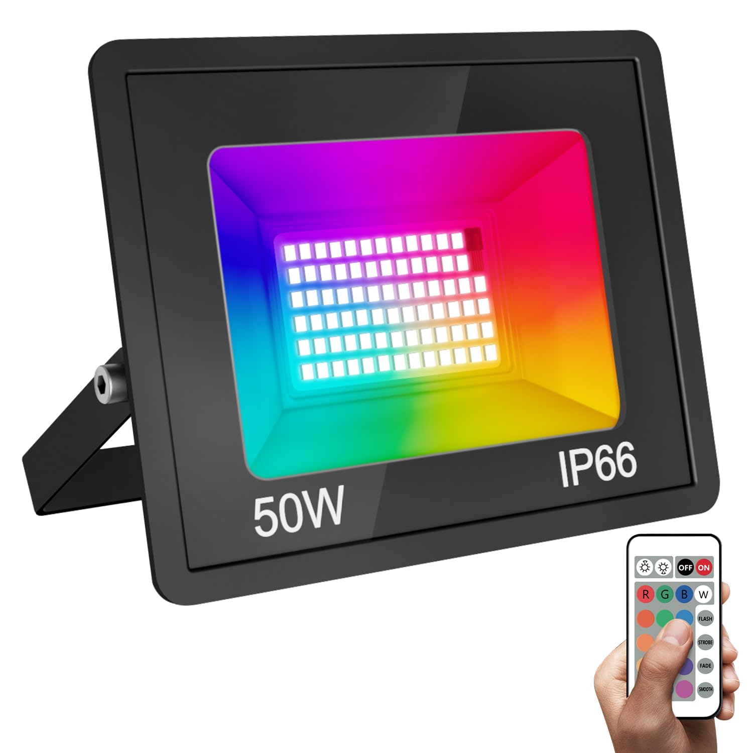 Transform your outdoor space with vibrant colour and dynamic lighting. Our LED RGB Floodlight is the ultimate solution for adding atmosphere, security, and style to your home. With effortless control and robust construction built for the British weather, it’s the perfect choice for year-round illumination. Key Features & Benefits 16 Vibrant Colours & Easy Remote Control Unleash your creativity with a spectrum of 16 static and dynamic colours. Using the convenient remote, you can instantly switch hues to set the perfect mood for any occasion—from a serene, relaxing glow in the evening to a vibrant party atmosphere in your garden. 4 Dynamic Modes & Fully Dimmable Brightness Take full control of your lighting ambiance. Choose from four exciting modes—Flash, Strobe, Fade, and Smooth—to bring energy to parties, Halloween, or Christmas displays. Furthermore, the continuous dimming function (10%-100%) allows you to fine-tune the brightness from a subtle wash of light to full-power illumination for enhanced security and visibility. Robust IP66 Waterproof & Durable Build Engineered to endure the UK’s unpredictable weather, this floodlight features a die-cast aluminum body, tempered glass, and a sealed silicone ring for superior IP66 waterproof protection Straightforward Installation & Wide Coverage Get your light up and running in no time. The fitting is hassle-free, thanks to the included 1m rubber cable and a 180° adjustable bracket. Once installed, enjoy broad, shadow-free illumination with a 120° beam angle, providing excellent coverage for driveways, patios, and gardens. Versatile for Numerous Outdoor Applications Its adaptable design makes it ideal for various locations. Easily mount it to illuminate gardens, garages, patios, porches, doorways, warehouses, and forecourts. We are confident in the quality of our product and are committed to your complete satisfaction with every purchase. Wattage: 50W
