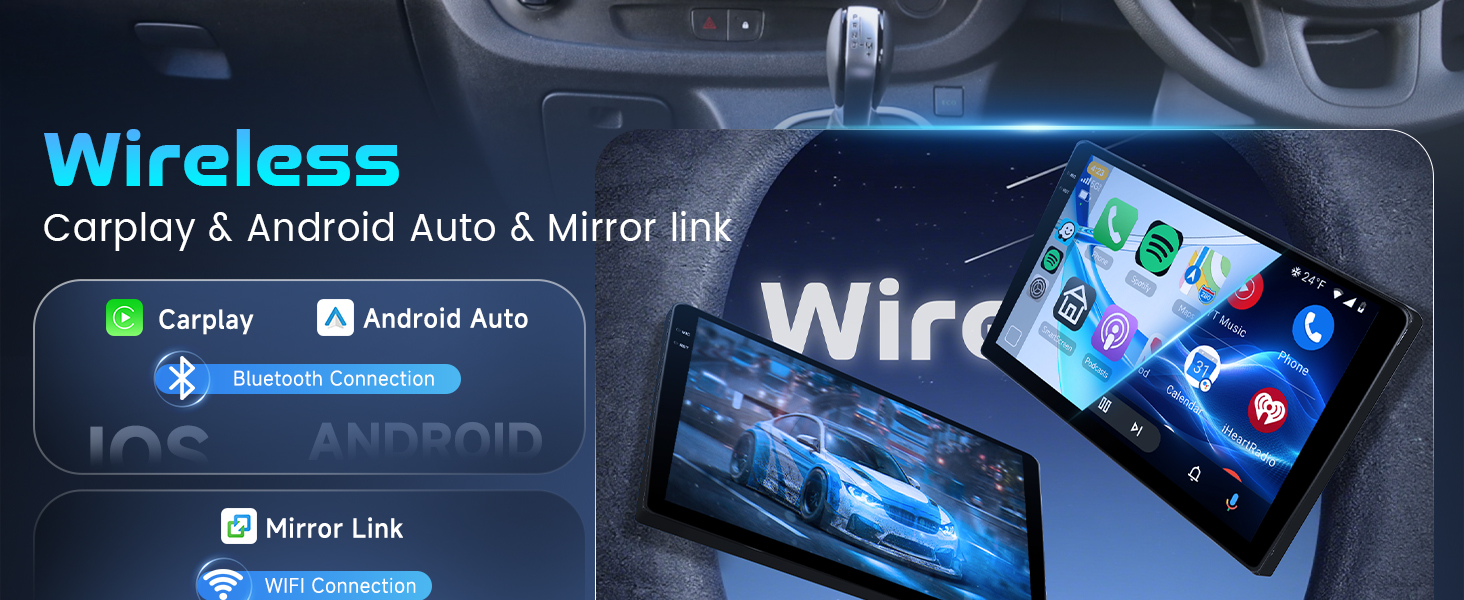 - 【Wireless CarPlay/Android Auto + Mirror Link】Auto-connects wirelessly CarPlay or Android Auto—no cables needed. Use Siri/Goo-gle Assistant for hands-free control of calls, messages, navigation, and music. Mirror Link (via USB/Wi-Fi) also casts your phone’s screen to play local videos or view photos for passengers.