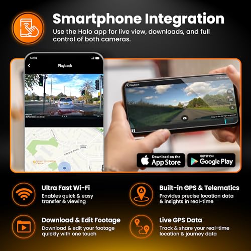 - Distraction Free Design Dash Camera – Unlike traditional dash cams, the Halo Spark features a compact, screenless design to eliminate in-car distractions and maintain a sleek interior. Easily preview, download, and share footage through the new UK-designed Halo app. Adjust settings, export clips, and access your recordings anytime, all from your smartphone.